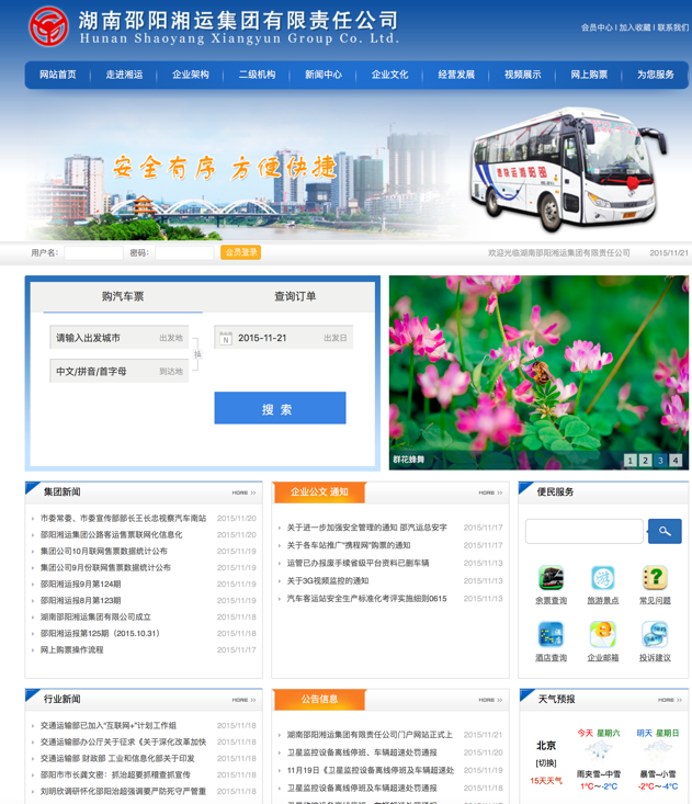 為加強(qiáng)企業(yè)信息化工作,利用網(wǎng)站推廣企業(yè)文化、提升內(nèi)部管理效率,湖南邵陽(yáng)湘運(yùn)集團(tuán)有限責(zé)任公司官方網(wǎng)站域名m.fwobl.com于11月11日通過(guò)審核,網(wǎng)站次日正式上線發(fā)布。集團(tuán)公司與旗下客運(yùn)子公司均有獨(dú)立版面,可發(fā)布文件信息、動(dòng)態(tài)新聞等,今后集團(tuán)公司的公文、通知等將在網(wǎng)上發(fā)布,各子公司在網(wǎng)上查看下載,極大提升了文件發(fā)布的效率。該網(wǎng)站最大的特點(diǎn)是可以查詢邵陽(yáng)地區(qū)一二級(jí)車站所有車輛班次、時(shí)間、價(jià)格信息,并可在線購(gòu)票,購(gòu)票成功后憑密碼或身份證前往車站自動(dòng)取票機(jī)(或人工售票窗口)取票,該網(wǎng)站為旅客提供了一個(gè)便捷的購(gòu)票渠道。