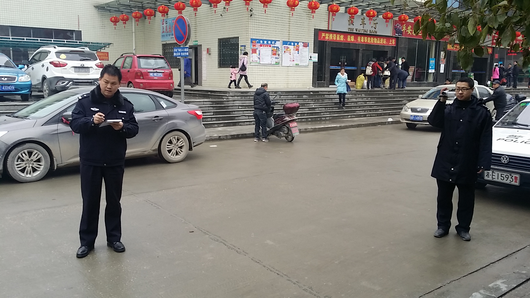 圖為湘運(yùn)集團(tuán)洞口客運(yùn)分公司稽查保衛(wèi)科工作人員配合交警部門對(duì)亂停亂擺車輛進(jìn)行抄牌錄像。